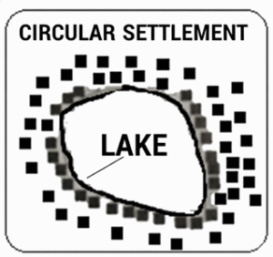 Such settlements develop around a pond, well, or lake. Due to the availability of water, houses are built close to each other in a circular shape.