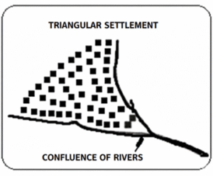 Triangular settlements develop at the confluence of two rivers or roads, or along the seashore. Due to natural or social factors, such settlements expand on all three sides.
