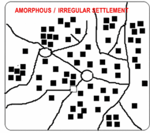3) आकारहीन वस्ती– वस्तींच्या निर्मितीनंतर वस्तींच्या चालणाऱ्या अनेक कार्यांबरोबर व त्या कार्याच्या विकासाबरोबर अशा वस्तीचा आकार वाढत जातो. वस्ती वाढतांना अनियमित आकाराने वाढत जाते, या वस्ती प्रकारात सोयीनुसार आणि जागेच्या उपलब्धतेनुसार घरे बांधलेली असतात.